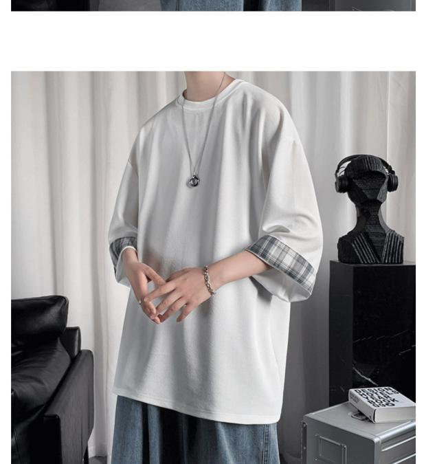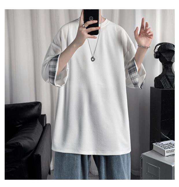 ビッグサイズルーズサマーメンズ半袖Tシャツ ラウンドネックTシャツ 学生チェック柄トップス